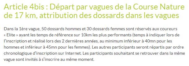 Notez que cela avait mal commencé : je m'étais inscrit il y a un certain temps déjà, pour avoir mon prénom sur le dossard. Quand je me suis inscrit, environ 200 personnes étaient déjà inscrites sur le 17 km et dans le journal du lendemain, j'ai vu que nous avons été un peu moins de 600 à finir la course. Donc, regardons à nouveau ce que dit le règlement :